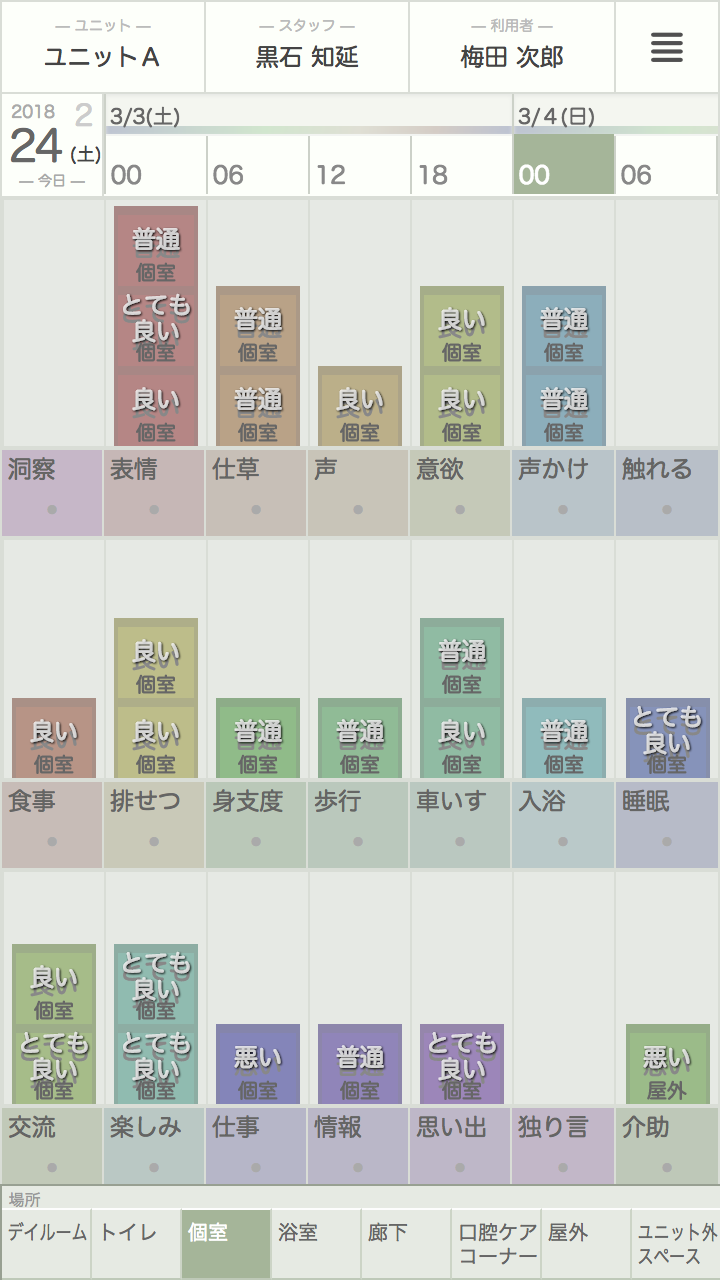 高齢者は自分の状態や気持ちを十分に表現・伝達できない場合が多くあります。スタッフが質の高いサービスを提供するためには高齢者の日々の状態の変化を正確に記録し、見える化し、その情報をスタッフ間で共有する必要があります。eyes はこの記録・分析・共有をお手伝いするソフトウェアです。